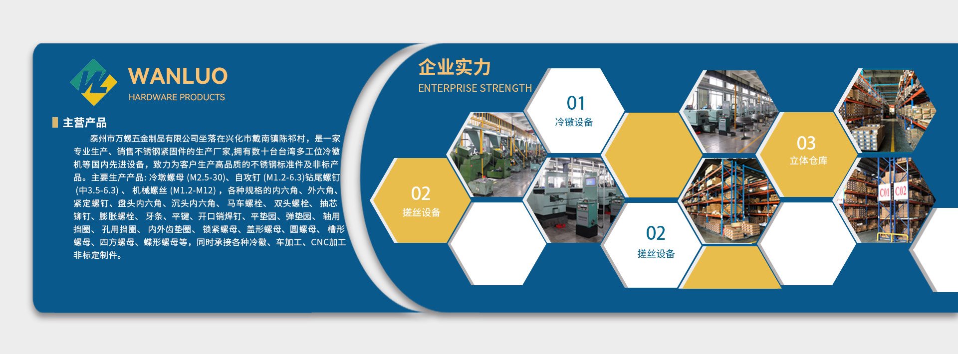 泰州市萬(wàn)螺五金制品有限公司是一家專(zhuān)業(yè)生產(chǎn)、銷(xiāo)售不銹鋼緊固件的廠(chǎng)家,坐落于興化市戴南鎮(zhèn)陳祁村工業(yè)園區(qū),擁有數(shù)十臺(tái)臺(tái)灣多功位冷鐓機(jī)等國(guó)內(nèi)先進(jìn)設(shè)備,致力為您生產(chǎn)高品質(zhì)的不銹鋼標(biāo)準(zhǔn)件及非標(biāo)產(chǎn)品。我廠(chǎng)堅(jiān)持以“質(zhì)量立企”為宗旨,擁有原材料改制,多工位冷成型,級(jí)進(jìn)高速?zèng)_壓,數(shù)控自動(dòng)車(chē)制,鈍化,涂層等生產(chǎn)工藝,引進(jìn)臺(tái) 【查看詳情】